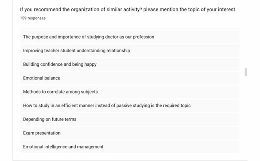 | · sensitized about different e-learning tools and formative assessment tools available | More specific discussions on the way for assessments would have been more helpful. |