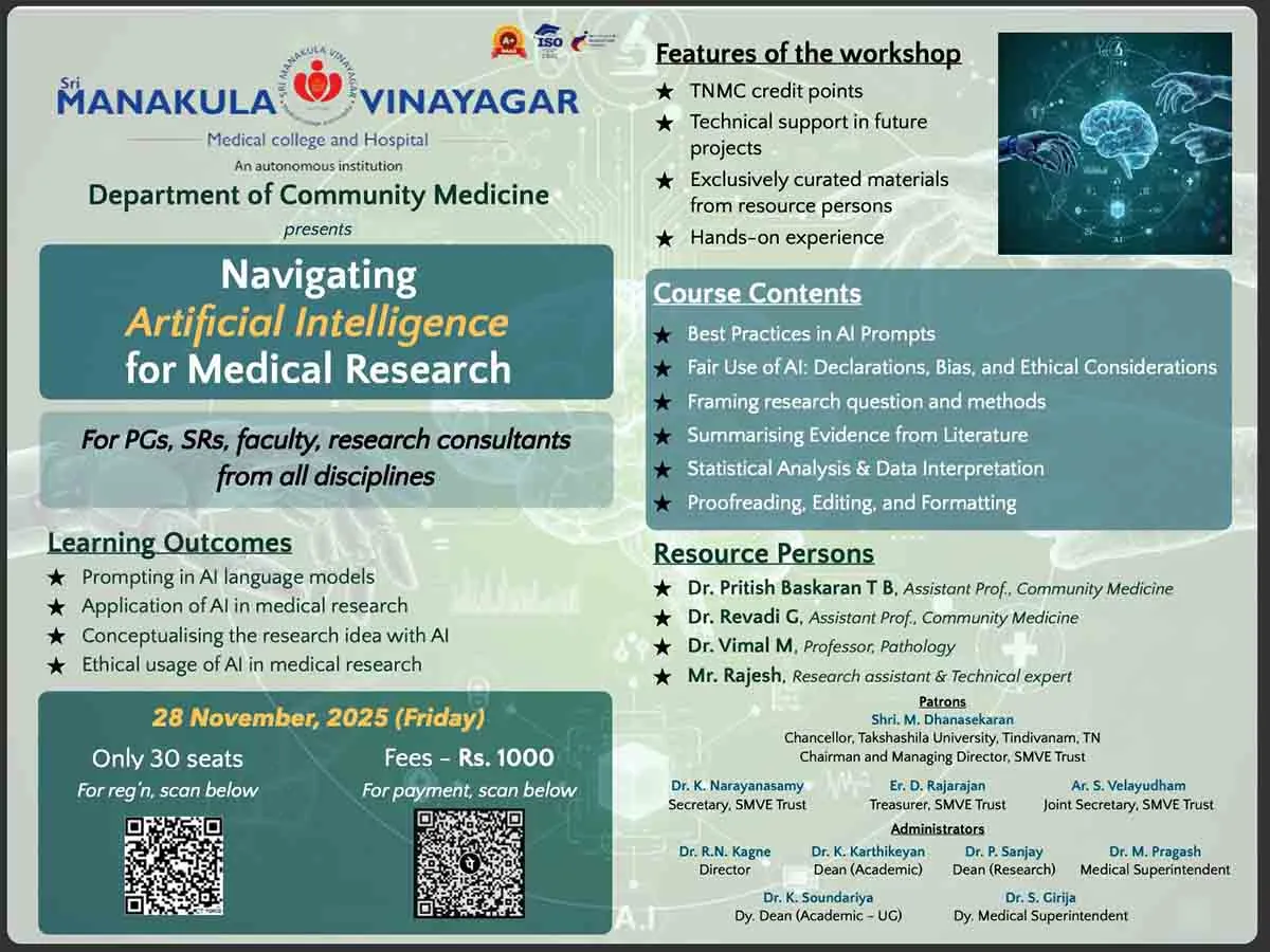 28th November 2025 @ 10:00 A.M Navigating Artificial Intelligence for Medical Research. Organized By: Dept of Community Medicine