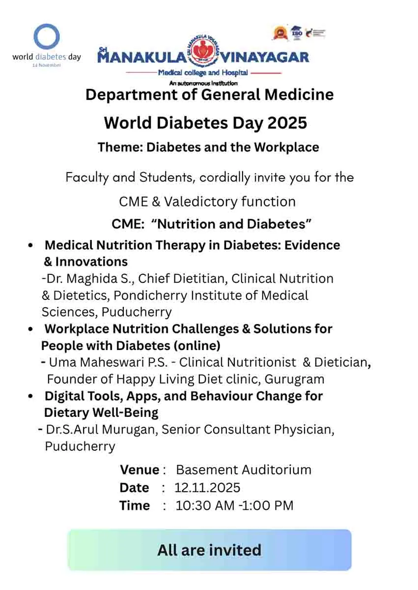 12th November 2025 @ 10:30 A.M – 1:00 P.M Diabetes and the Workplace . Organized By: Dept of General Medicine