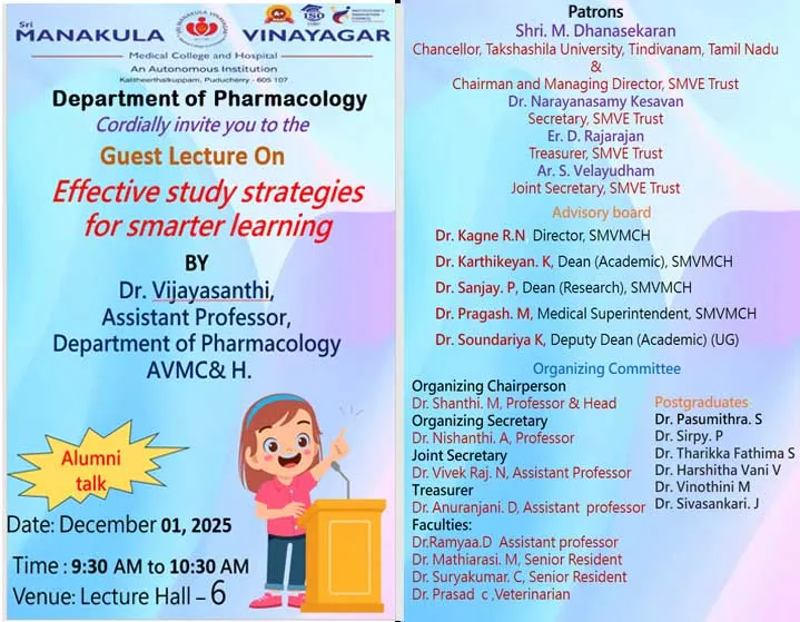 01th December 2025 @ 8:30 A.M -10:30 A.M Effective Study strategies for smarter Learning. Organized By: Dept of Pharmacology